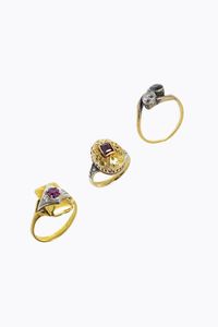 LOTTO DI TRE ANELLI -in oro giallo ed argento XIX secolo, modello contrarié, con uno zaffiro taglio rotondo ed [..]