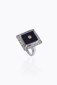 ANELLO Peso gr 5,6 Misura 16 (56) in oro bianco 14 Kt, sommità rettangolare con inserto in onice e diamanti taglio [..]