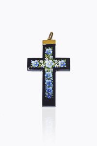 CIONDOLO Cm 5,6x3,5 in onice, XIX secolo, a forma di croce (rotture) al centro micromosaico a motivo floreale