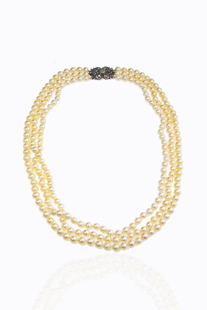composto da tre fili di perle giapponesi del diam. di mm 6,5-7,0 ca. Chiusura in argento ed oro a bassa caratura, rosette e smeraldo centrale