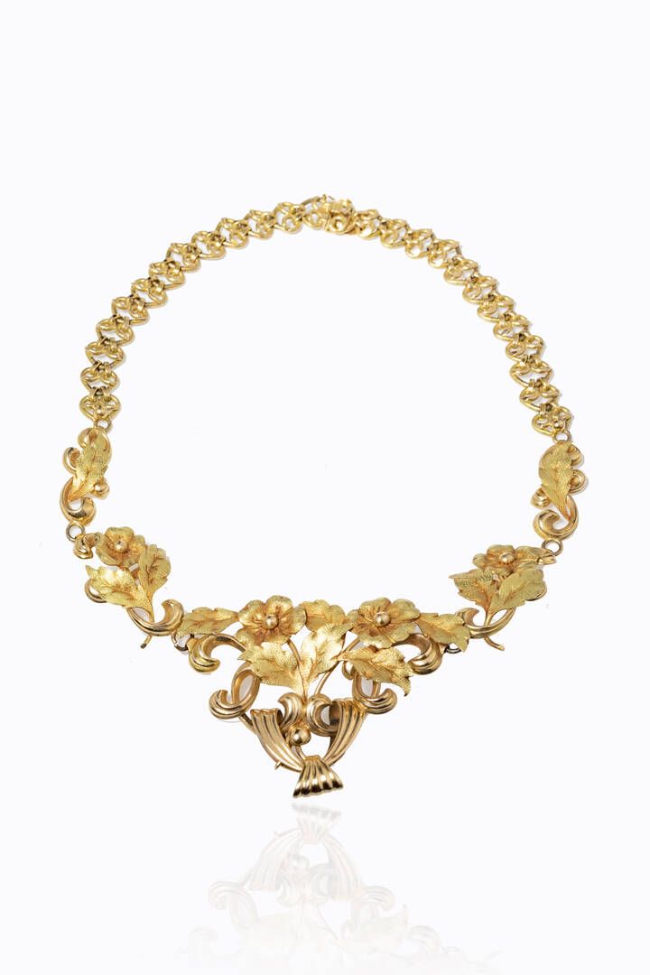 in oro 14 Kt, maglie ad anello lavorato a corda, al centro motivo floreale satinato