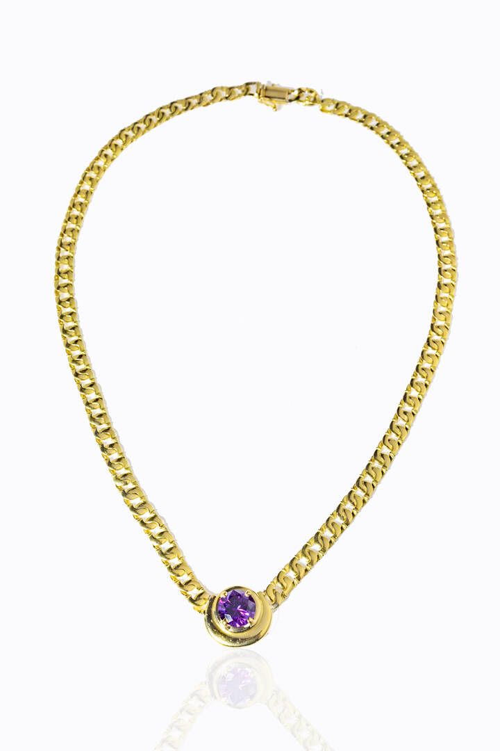 in oro giallo, a maglia groumette appiattita, al centro ametista taglio rotondo sintetica.