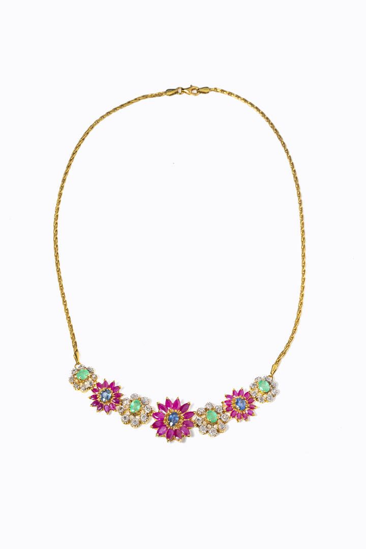 in oro giallo, al centro fiori in rubini taglio navette, smeraldi e zaffiri taglio ovale per totali ct 4,70 ca e diamanti taglio 8/8 per totali ct 0,30 ca