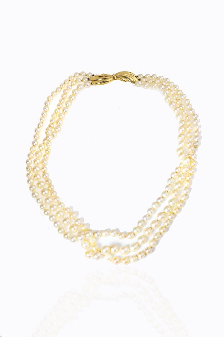 tre fili di perle giapponesi a scalare del diam. di mm 6 a7 ca. Chiusura in oro giallo a fiocco.