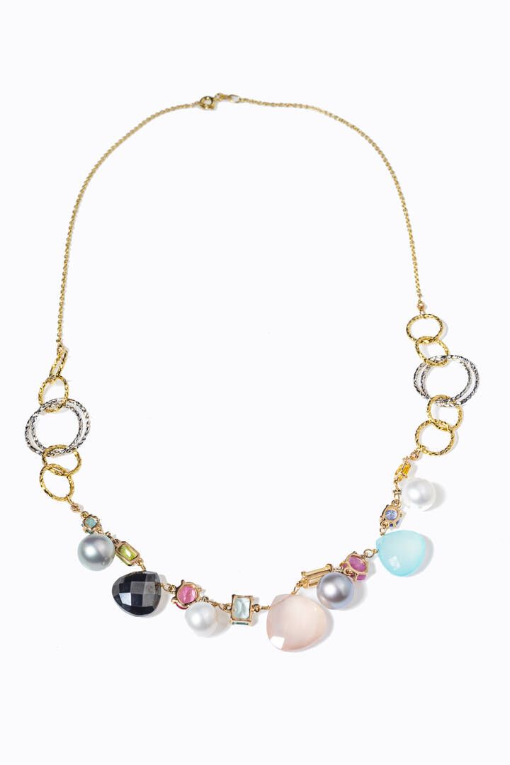 in oro giallo e bianco composto da anelli lavorati, al centro pietre fini di vari tagli e perle di acqua dolce.