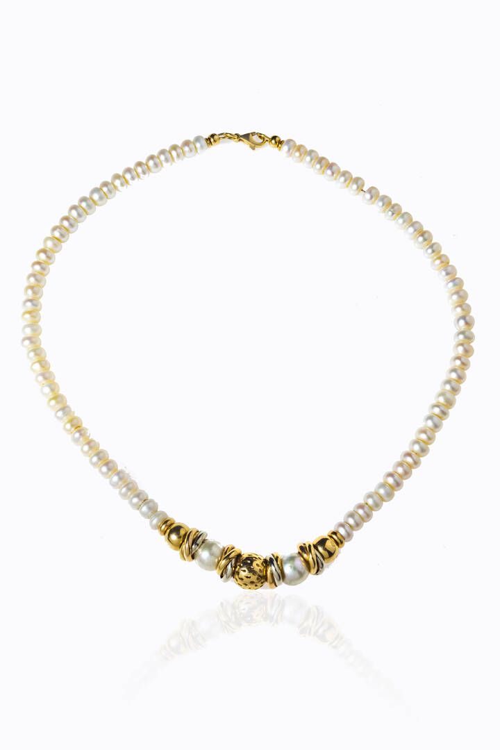 composto da un filo di perle cipolline, al centro due perle giapponesi alternate da sfere e distanziali in oro giallo e bianco