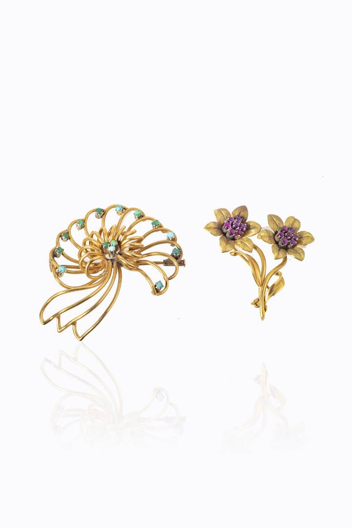 -composta due fiori con corone in rubini taglio rotondo per totali ct 0,70 ca. Peso gr 8,1. Cm 4x3,5