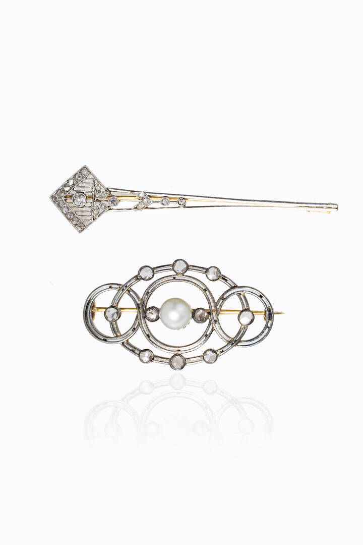 -in oro a bassa caratura ed argento, XIX secolo, ad intreccio con al centro perla giapponese del diam. di mm 6,5 ca e rosette di diamanti. Peso gr 8,8. Cm 4,5x2,5