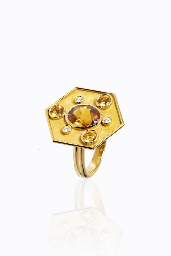 Anello in oro giallo lucido e satinato, firmato 'Niali', sommità esagonale con al centro quarzo citrino