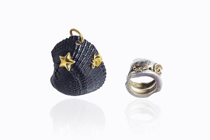 -ciondolo con conchiglia dipinta ed impreziosita da anello e stelle in oro giallo.