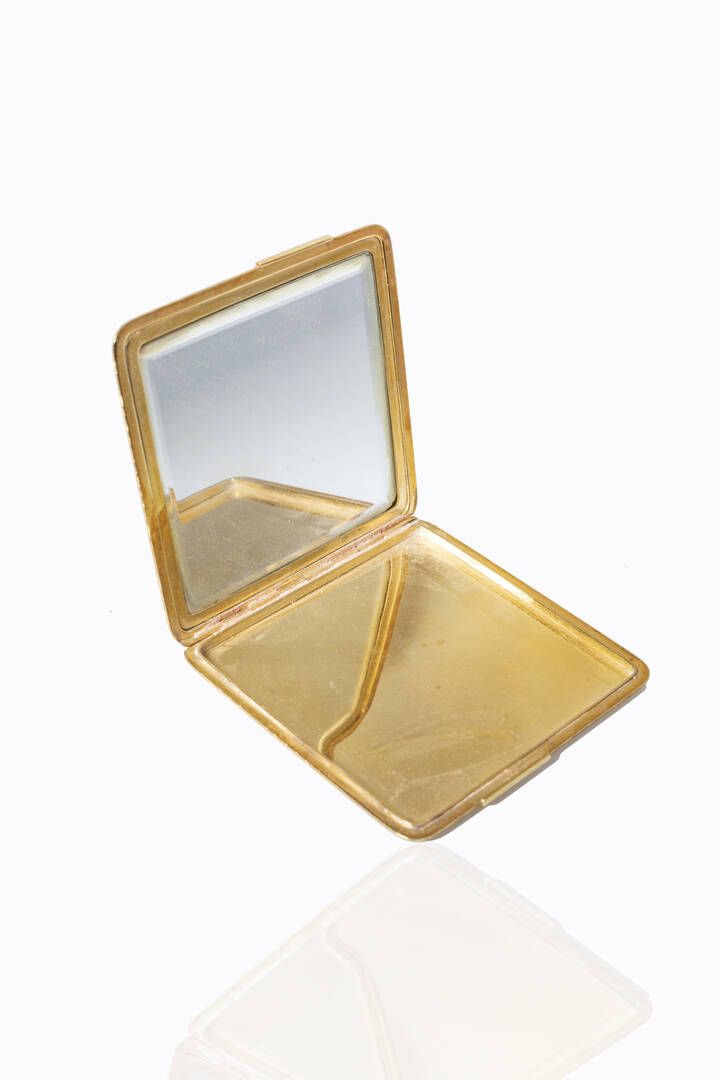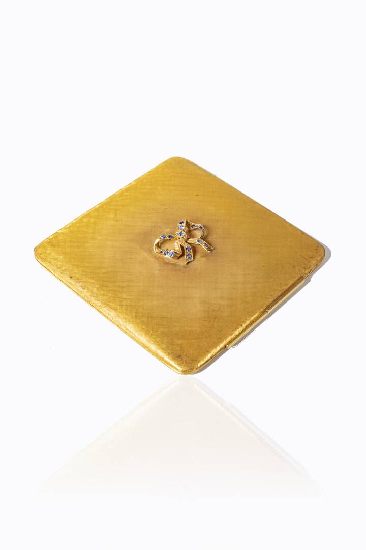 in oro giallo satinato, anni '50, con al centro fiocco in zaffiri taglio rotondo. Reca specchio interno