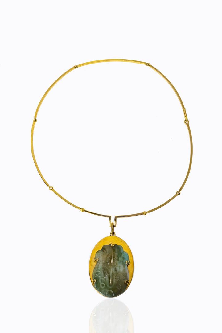 Girocollo rigido, geometrico, in oro giallo, con ciondolo in oro giallo, firmati 'Repossi', con due pesci in giadeite verde