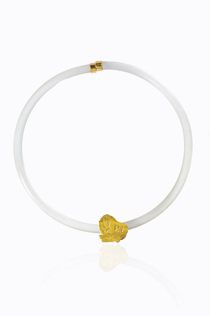 Girocollo in materiale plastico trasparente con terminali in oro giallo e al centro ciondolo in oro giallo, firmato 'Licata', inciso a motivi astratti. esemplare unico