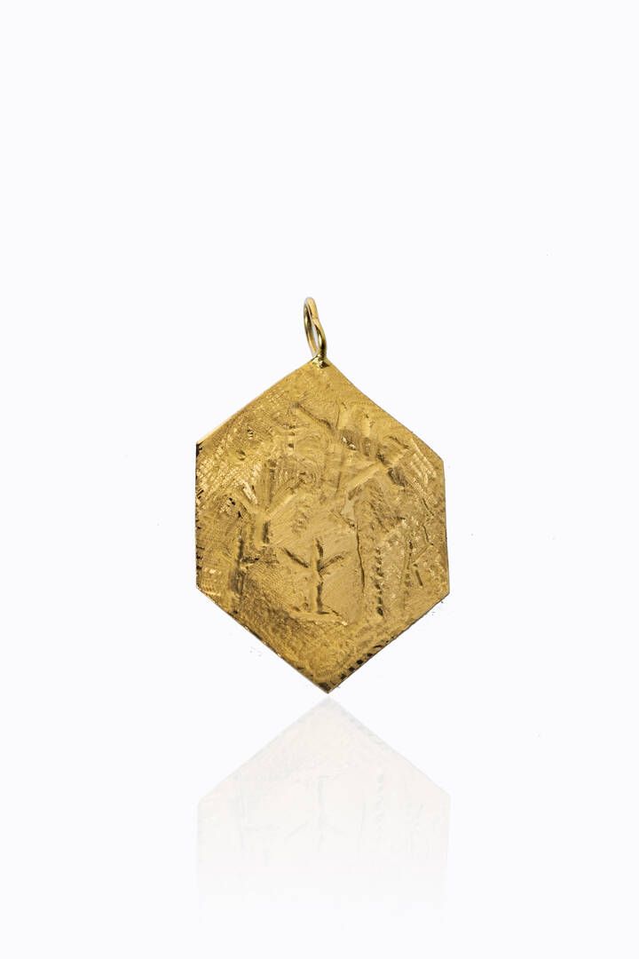 Ciondolo in oro giallo, di forma esagonale, firmato 'Licata', fronte satinato inciso con motivi astratti. Esemplare unico