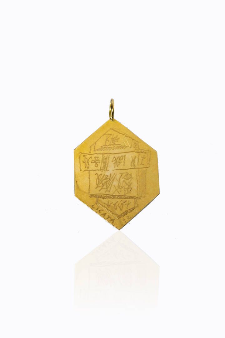 Ciondolo in oro giallo, di forma esagonale, firmato 'Licata', fronte inciso con motivi astratti. Esemplare unico