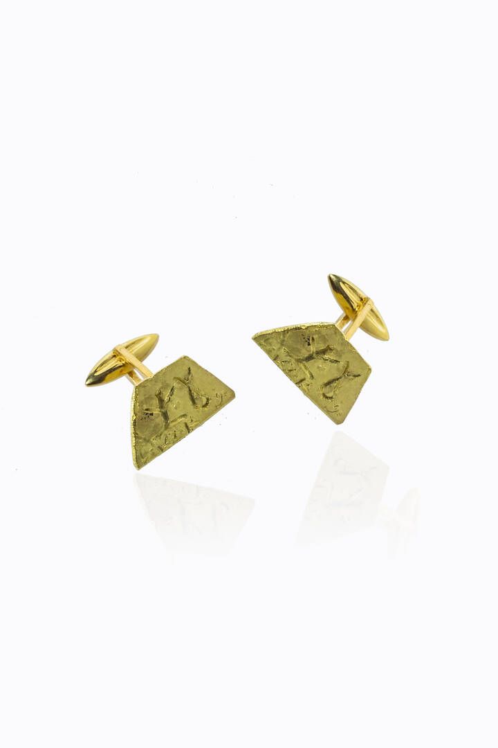 Coppia di gemelli in oro giallo, firmati 'Licata', composti da lastre incise a motivi astratti. Esemplare unico.