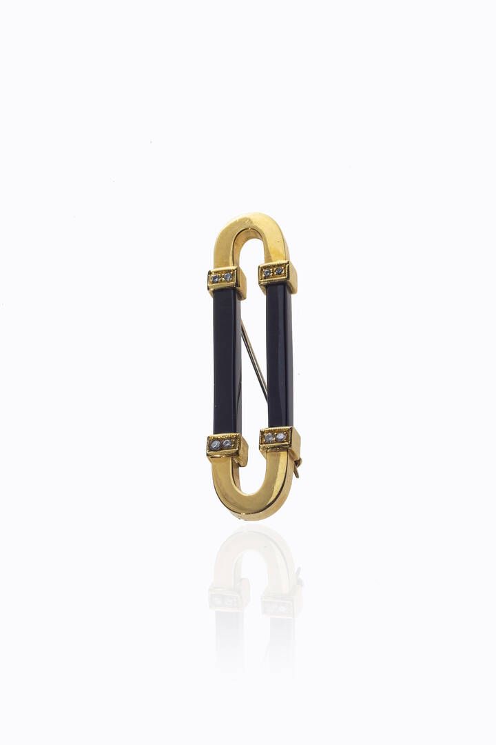 in oro giallo e onice, a forma di anello ovalizzato. Quattro diamanti taglio brillante a decoro