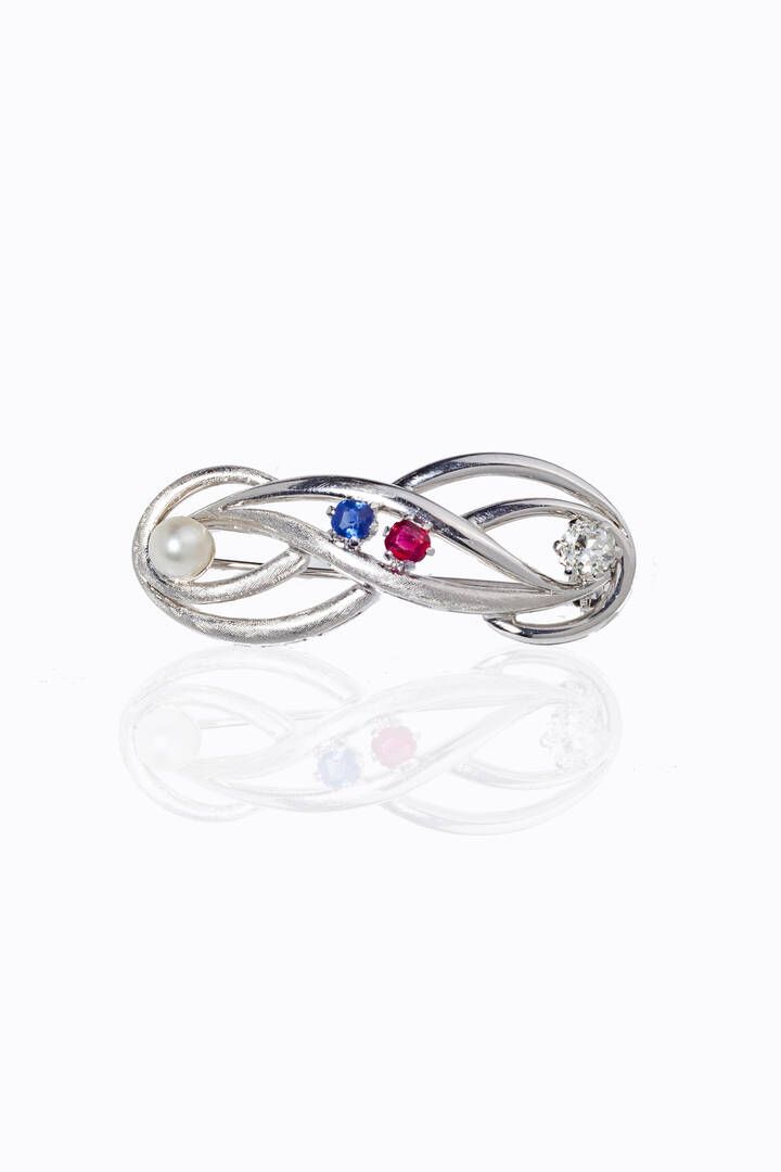 in oro bianco, anni '50, ad intreccio, con pietre sintetiche di vari colori, una perlina e un diamante taglio vecchio di ct 0,50 ca
