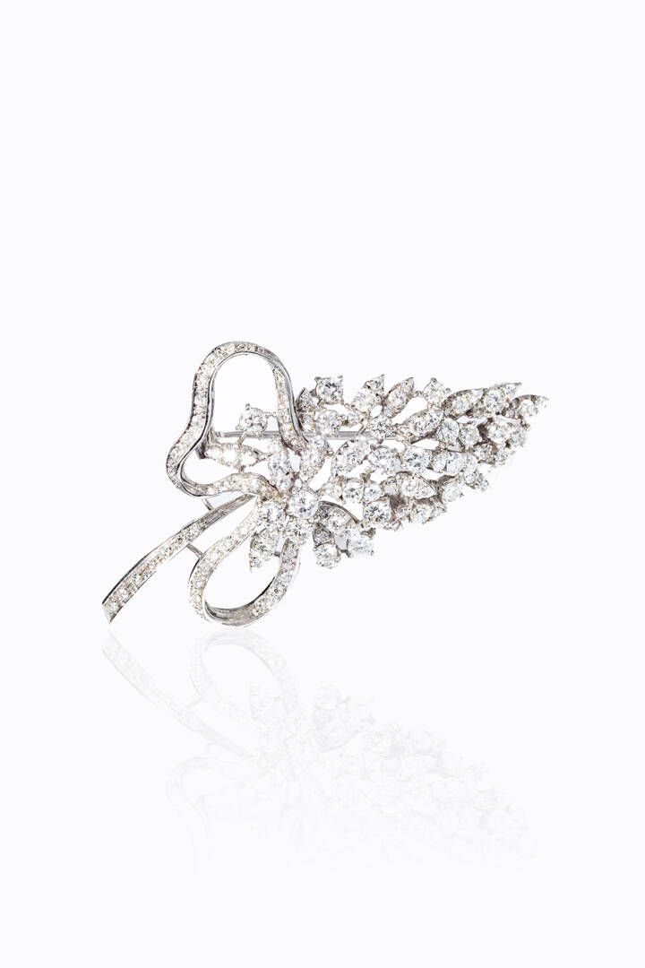 in oro bianco, anni ’50, nella parte superiore fiocco da cui diparte una cascata di diamanti taglio brillante per totali ct 3,0 ca.