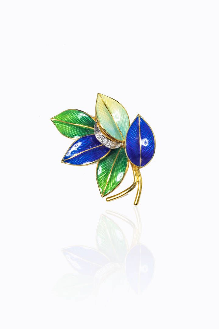 in oro giallo, a forma di mazzo di foglie in smalti nei toni del verde e del blu. Diamantini taglio 8/8 a decoro