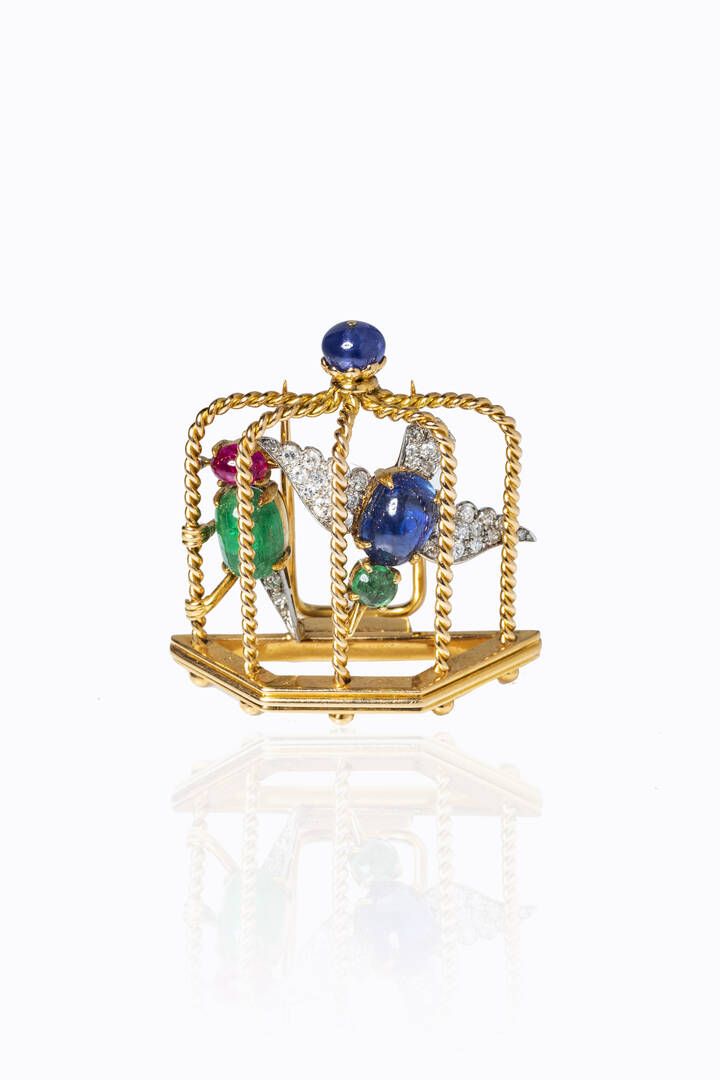 SPILLA Peso gr 13,1 Cm 3x3 in oro rosa, anni ’60, a forma di piccola gabbia con all’interno due uccellini: corpi con due smeraldi cabochon per totali ct 1,30 ca. due zaffiri cabochon di ct 2,0 ca, un rubino cabochon di ct 0,30 ca. Diamanti taglio brillante e 8/8 per totali ct 0,30 ca a decoro.