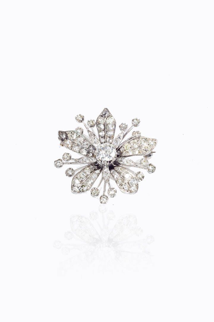 in oro bianco, a forma di fiore, inizi XX secolo, con diamanti di vecchio per totali ct 4,0 ca