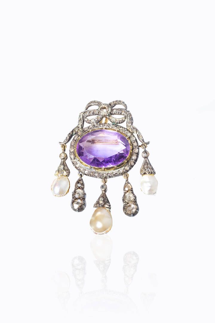 in oro a bassa caratura ed argento, XVIII secolo, al centro grande ametista taglio ovale, sormontata da fiocco in rosette di diamanti per totali ct 1,50 ca. Frange pendenti in rosette e perle scaramazze mabé.