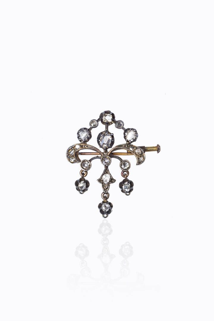 in argento e oro a bassa caratura, XIX secolo, a voluta, con rosette di diamanti per totali ct 0,65 ca
