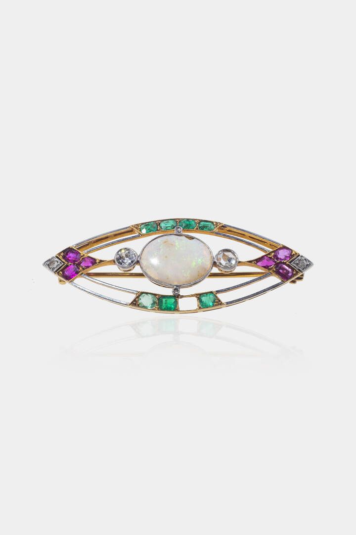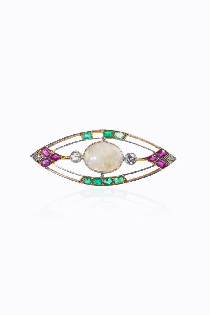in oro giallo, a losanga, inizi XX secolo al centro opale (scheggiato) cabochon, smeraldi taglio rettangolare (uno mancante), rubini e diamanti taglio brillante di vecchio e rosette per totali ct 0,40 ca