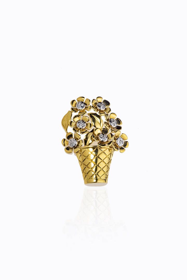 in oro giallo, a forma di vaso di fiori, con diamanti taglio 8/8 per totali ct 0,21 ca