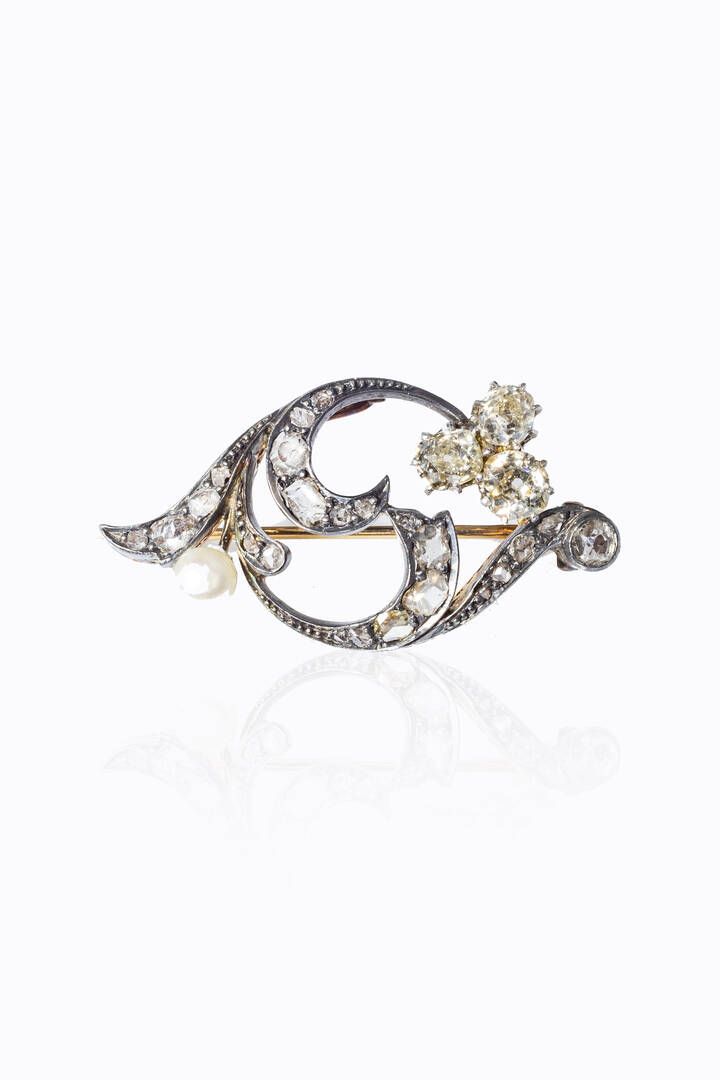 in oro a bassa caratura ed argento, XIX secolo, a voluta con diamanti taglio brillante di vecchio taglio e rosette per totali ct 1,50 ca, rosette e perlina a decoro