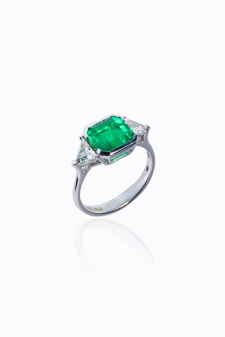 Anello in oro bianco con al centro smeraldo colombiano di ct 2,43 ca (leggera mancanza), vivid green, miniera di Muzo. ai lati due diamanti taglio triangolare.