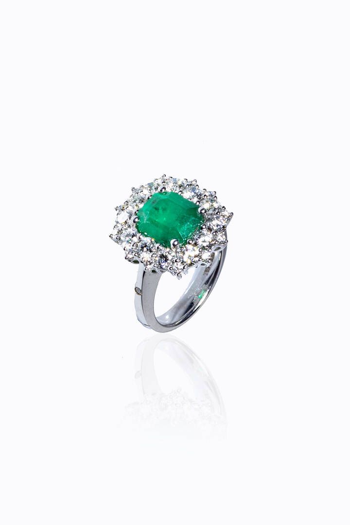 Anello in oro bianco, sommità a margherita, al centro smeraldo colombiano di ct 3,34, vivid green, miniera di Muzo, contornato da diamanti taglio brillante per totali ct 2,40 ca, colore F, purezza VS.