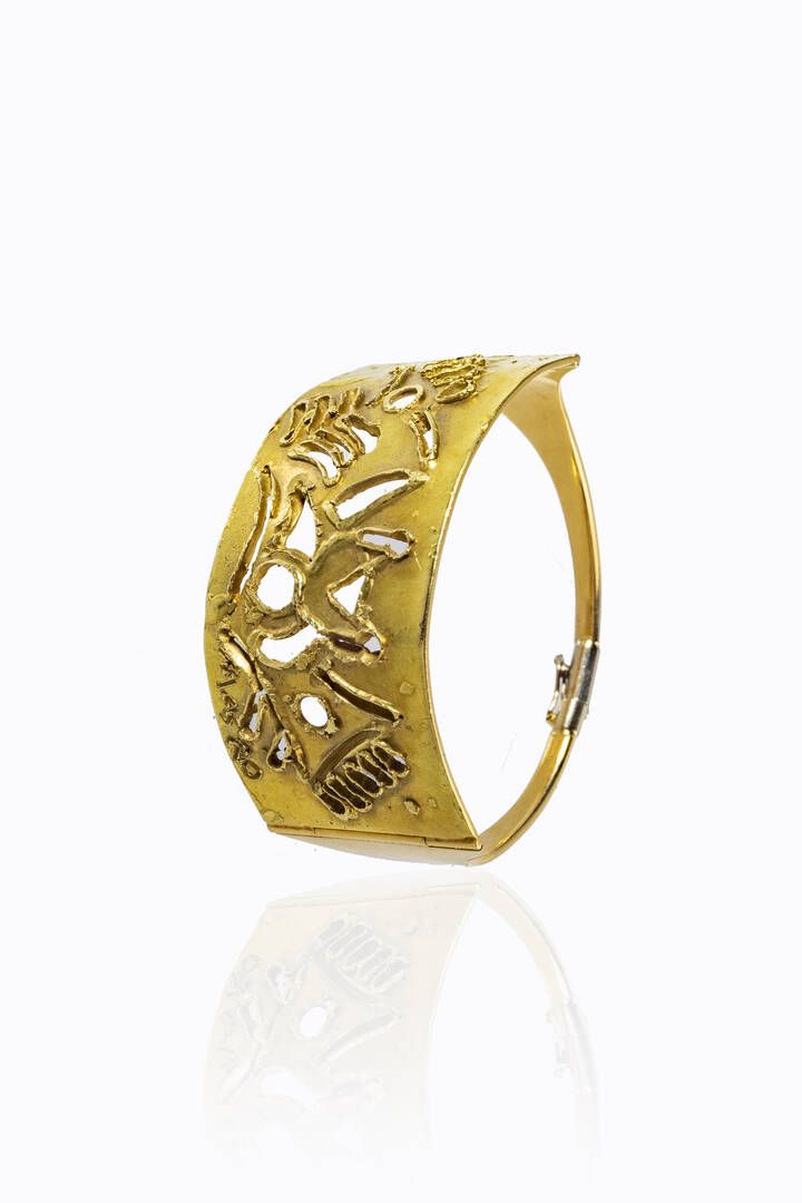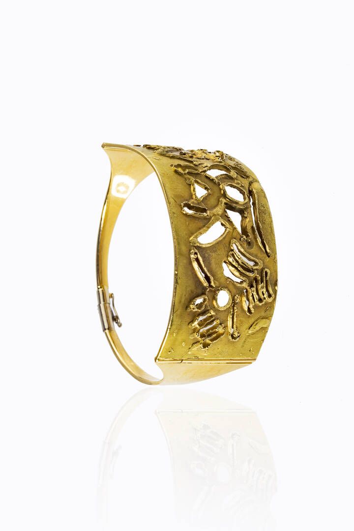 UMBERTO MASTROIANNI Fontana Liri (FR) 1910 - 1998 Marino (Roma) Peso gr 39,3 Lunghezza cm 15 Diam. interno 5 cm Bracciale rigido in oro giallo, firmato 'Mastroianni' composto da placca centrale curvata, incisa e lavorata a motivi astratti. Esemplare unico. Autentica dell'artista su fotografia. Bibl.: F. De Santi, 'Umberto Mastroianni, Artista e intellettuale del XX secolo. Documenti', 2002, pubbl. pag. 86