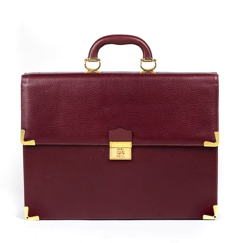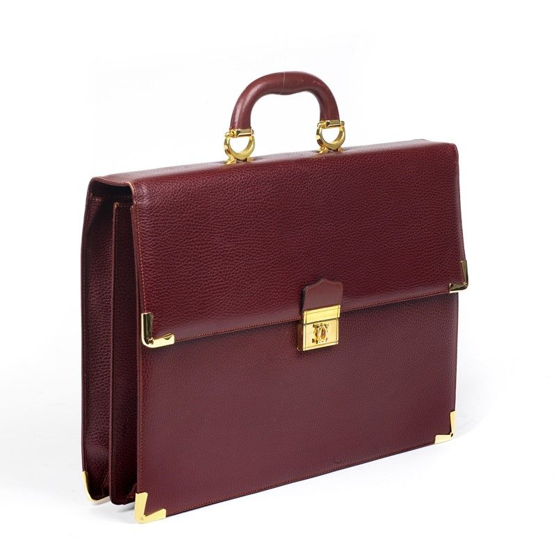 CARTIER VALIGETTA DA LAVORO MUST DE CARTIER Nella caratteristica pelle bordeaux, con angoli e chiusura in ottone dorato, con una maniglia in pelle e interno in moiré tono su tono logo allover, con doppio scomparto e tasca con zip. Corredata di dust bag originale. Dim. cm 40x30x10 CARTIER BRIEFCASE