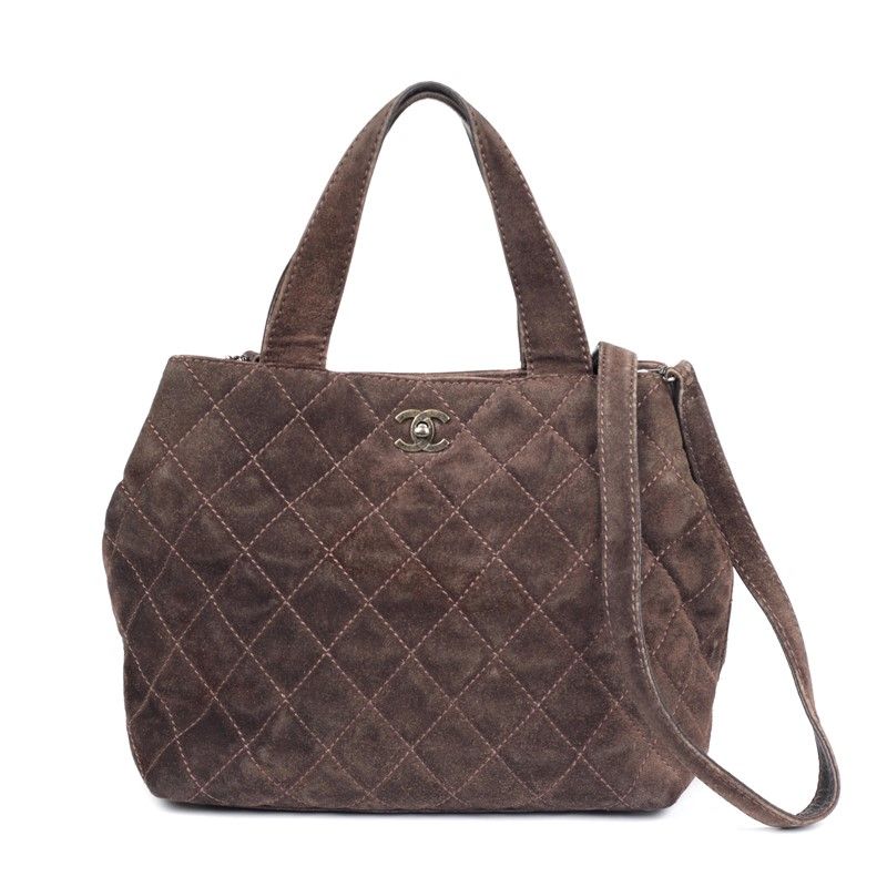 In camoscio trapuntato marrone con metalleria in ottone invecchito. Doppio manico e tracolla staccabile.Fodera marrone logo all over e chiusura in metallo con doppia C.