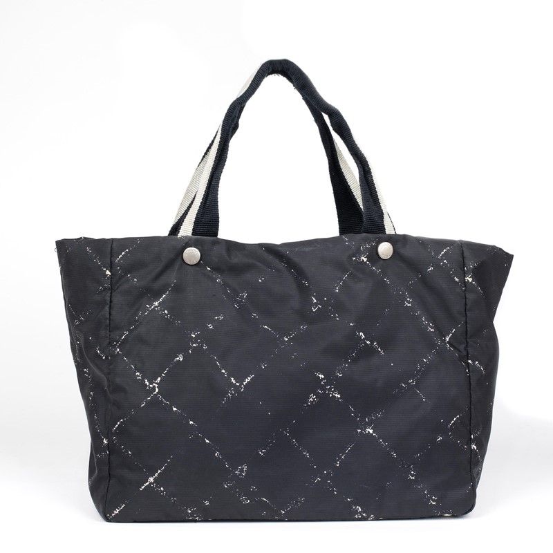 CHANEL BORSA A MANO In tessuto di nylon nero e sabbia,con stampa che ricorda il matellassé delle borse della Maison; perfetta come seconda borsa da viaggio. Metalleria in color argentoe doppio manico in nastro nero e sabbia; datata primi anni 2000. Dim. cm 35x27x14