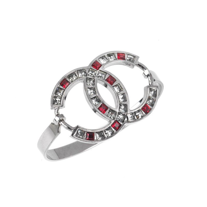In ottone color oro con dettagli in cristalli rosso e trasparente sulla maxi doppia C.
