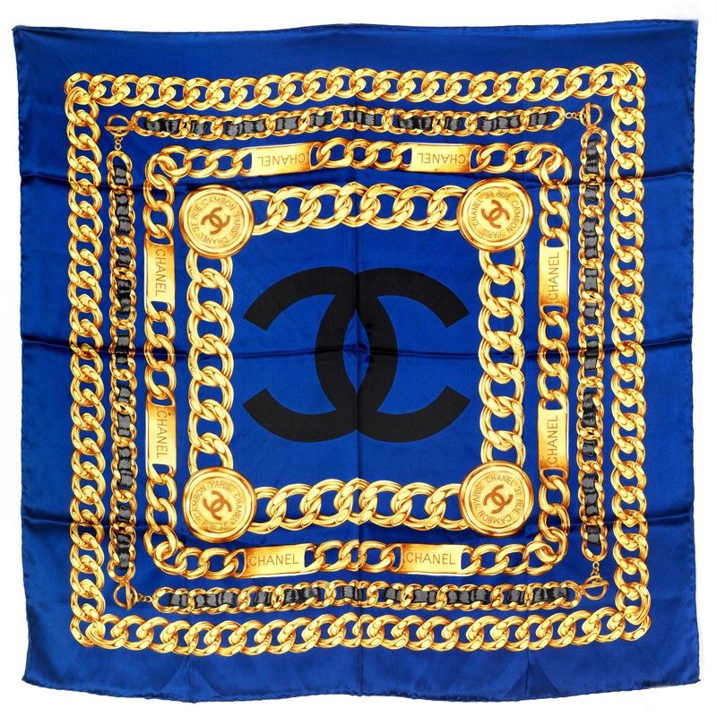 In seta 100% in blu acceso e oro, con stampa catene e logo centrale.