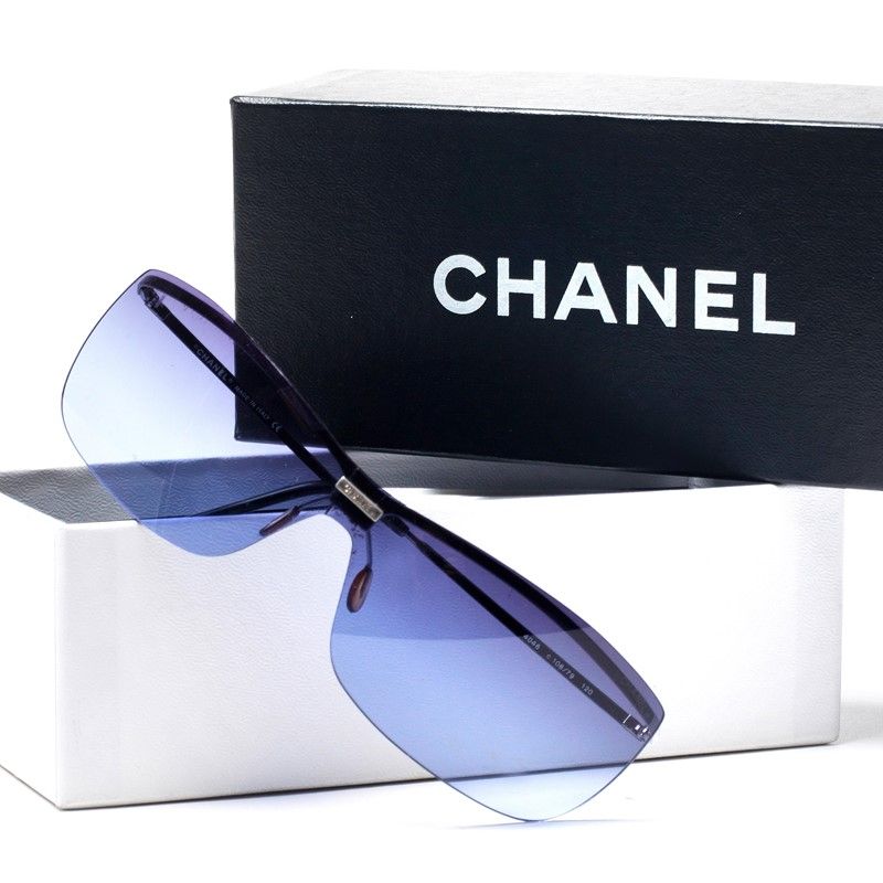 Occhiali a mascherina ultra leggeri con lenti azzurrate e aste color argento invecchiato.