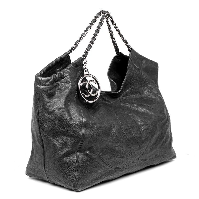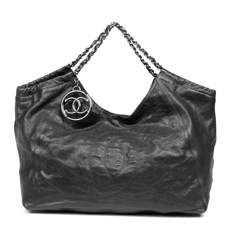 CHANEL SHOPPING TIMELESS Ottima grande borsa shopping per un uso quotidiano in pelle granulata Caviar nera anticata e manici in catena in ottone color argento con pelle intrecciata. Charm con logo e logo trapuntato frontale. Fodera in tessuto nero logo all over. Corredata di carta di identificazione e dustbag originali. Dim. cm 43x29x20.