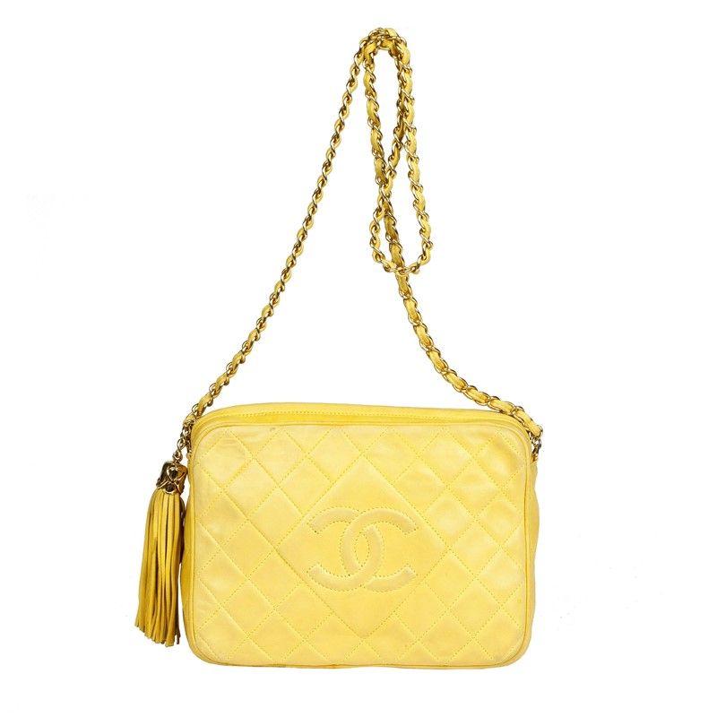 In pelle gialla con catena intrecciata con pelle in ottone e maxi nappa in pelle come tiralampo; risalente alla fine degli anni 80.