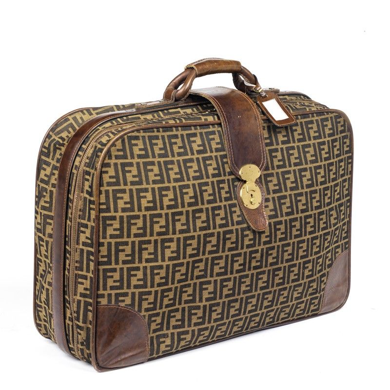 FENDI VALIGIA SEMIRIGIDA In tessuto Zucca marrone e nero, con bordi e angoli in pelle marrone, come il resistente manico e il passante a chiusura fromtale; zip con doppio cursore in ottone come il resto della metalleria. Fodera in tela beige con una tasca con zip e doppio passante per abiti. Corredato di portainidirizzo. Dim. cm 60x40x18.