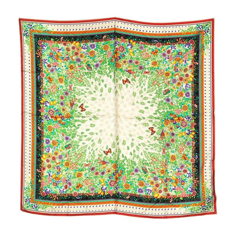 In seta 100%, con stampa floreale dove prevalgono il verde e e i colori degli animali che riempiono i prati primaverili.