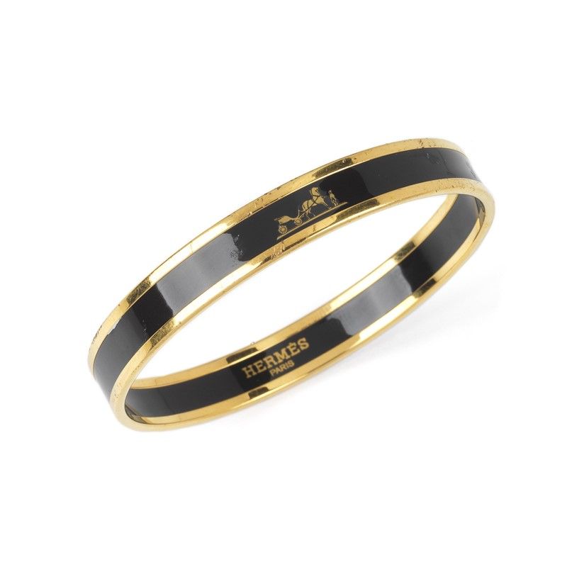 In metallo color oro e disegni smaltati con logo all over nei toni del nero e oro