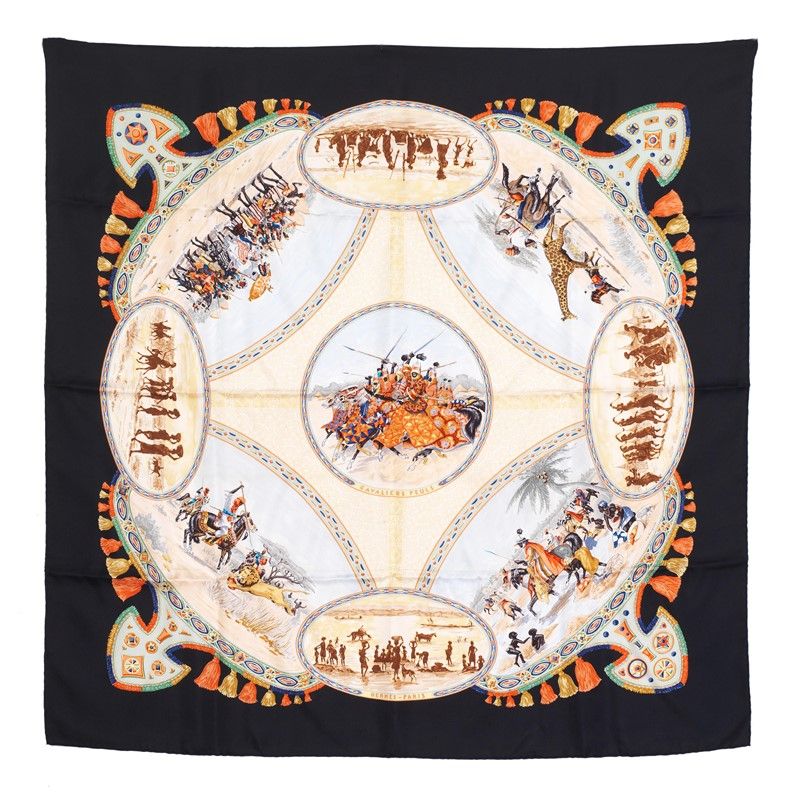 HERMES FOULARD "CAVALIERS PEULS" Stampa firmata da Jean De Fougerolles a rappresentare momenti diversi della vita dei Fulani, tribù nomade dell'Africa occidentale. I colori sono tipici della terra africana, dal sabbia fino all'azzurro del cielo, in una cornice nera. Corredato di scatola originale. Dim. cm 90x90
