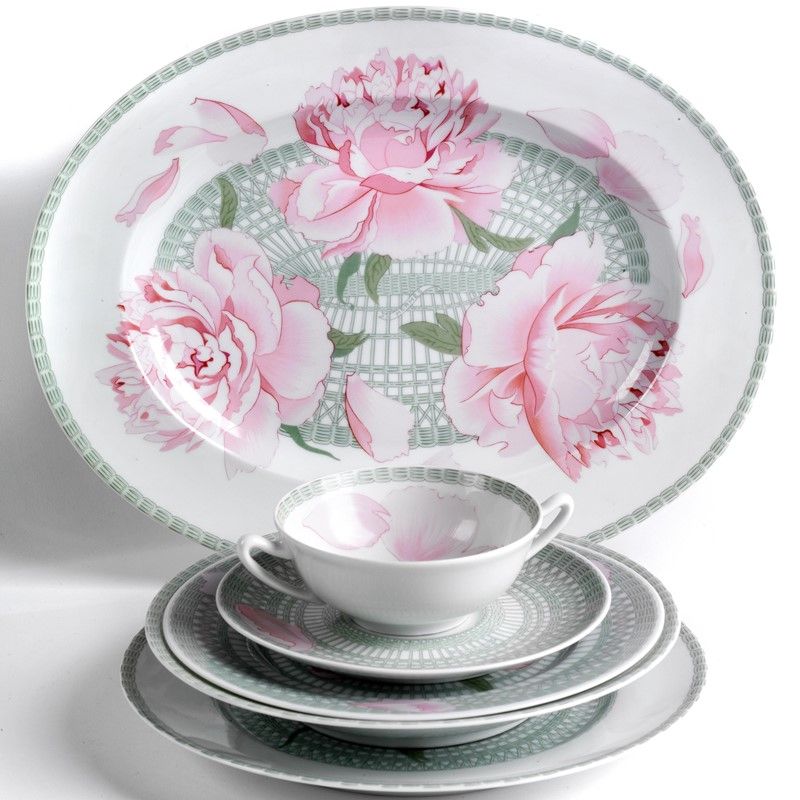 Bellissimo disenia Peonia, delicato nei suoi colori per una tavola primaverile. Composto da: 47 piatti piani, 24 scodelle, 48 piatti frutta, 2 insalatiere, 2 vassoi medi, 11 tazze da consommé, 12 piattini.