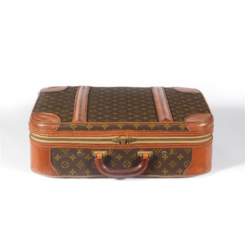 In tela marrone Monogram, valigia vintage con angoli e fasce in vacchetta, come anche la maniglia; doppia zip di chiusura, fodera in tessuto beige con cinghie per i vestiti.