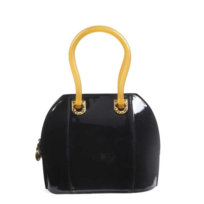 Mini borsa in vernice nera con doppio manico curvato in resina color senape; doppio cursore logato in color oro. Interno in moiré bordeaux con taschina con zip.