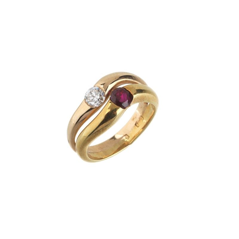 ANELLO A DOPPIA FASCIA CON RUBINO E DIAMANTE in oro giallo e oro rosa 18kt, di forma ondulata, impreziosito da un rubino taglio rotondo di ct 0.30 circa e un diamante taglio brillante di ct 0.30 circa, punzone 750, mis. 53, gr. 7